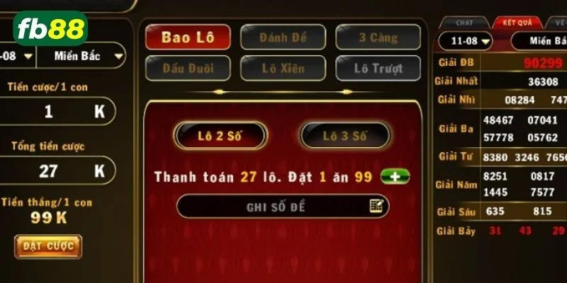 Lô tại FB88 được tổ chức theo lối chơi cơ bản, người chơi chọn một số từ 00 đến 99. Nếu số này xuất hiện ở bất kỳ vị trí nào trong các giải của kết quả xổ số, người chơi thắng cược. Tỷ lệ trả thưởng cho hình thức này thường là 1 ăn 3, tức là đặt 1.000 VND sẽ nhận được 3.000 VND cho mỗi lần số xuất hiện.